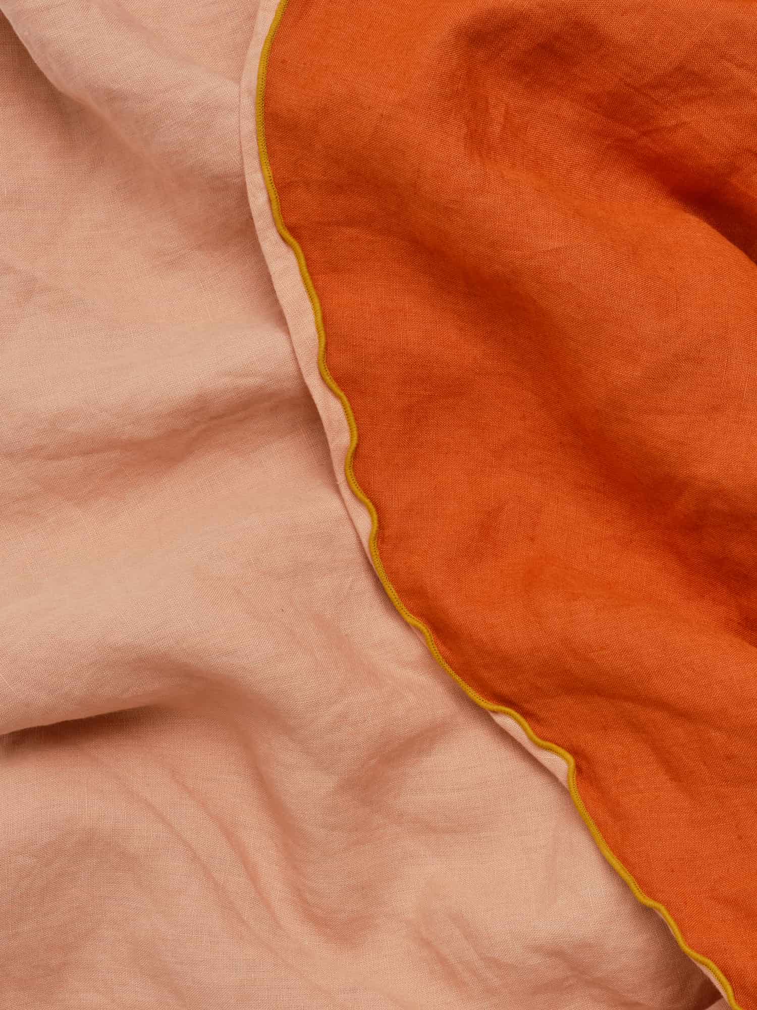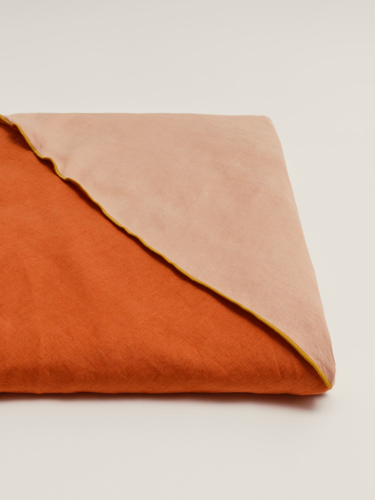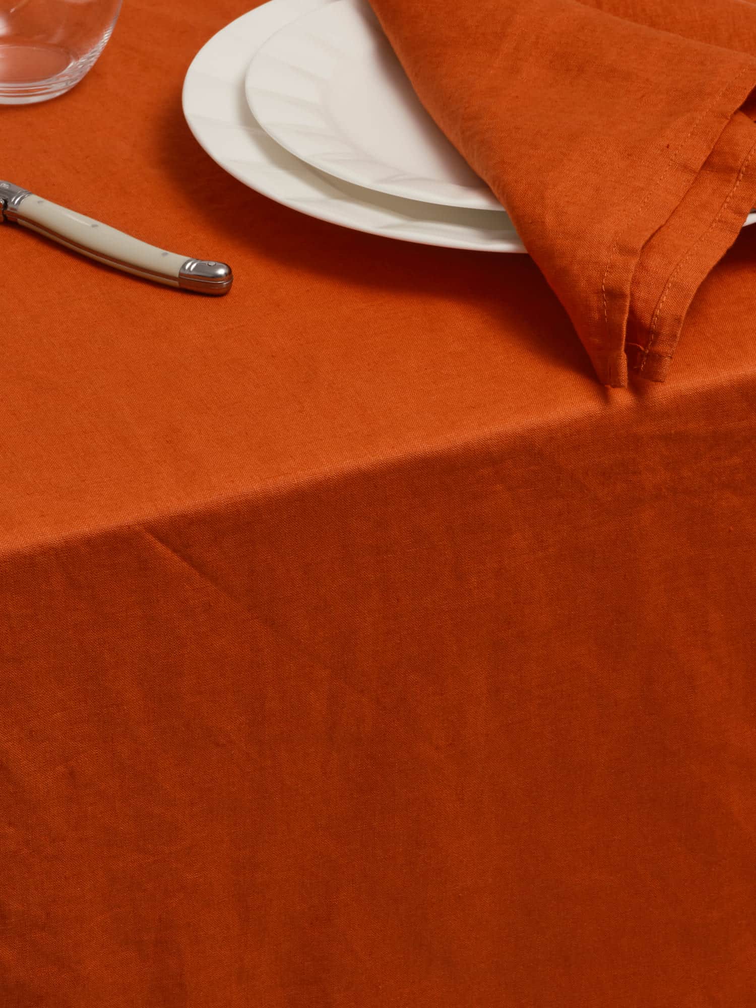 From cozy meals at home to alfresco dinner parties, elevate your dining experiences with our 100% French linen Tablecloth in Cantaloupe. It features two layers in two different colours: Sangria and Marmalade. It’s a double-sided version which will ensure you have a hue to suit every occasion. Available in 4 sizes: Small, Medium, Large and Round. Pair them with our Linen Napkins to complete the premium look.